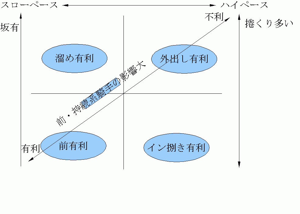 単純にこんなうまく分けるのは難しいですが、脚質と捲くるタイプか溜めるタイプか、坂があるかないか。
